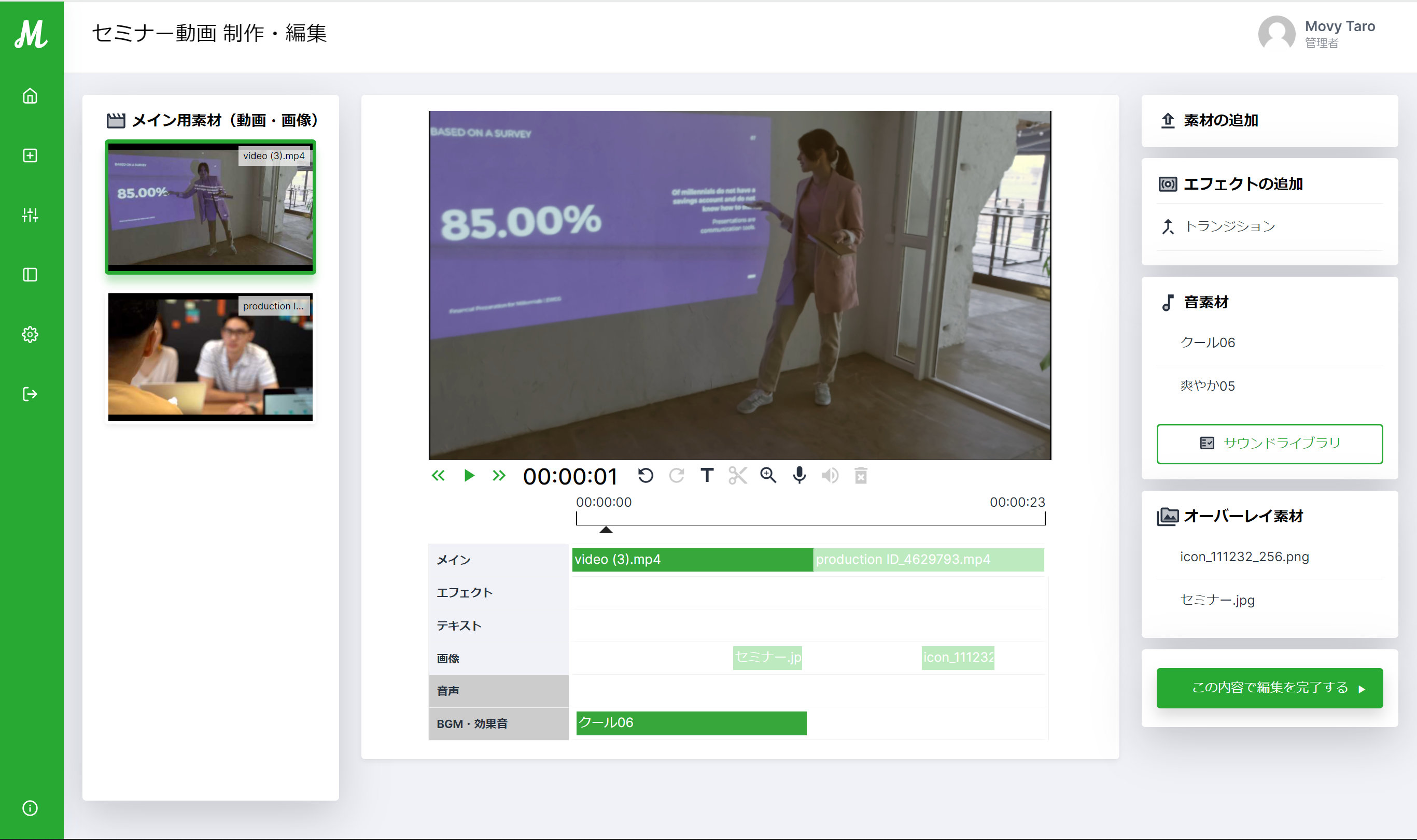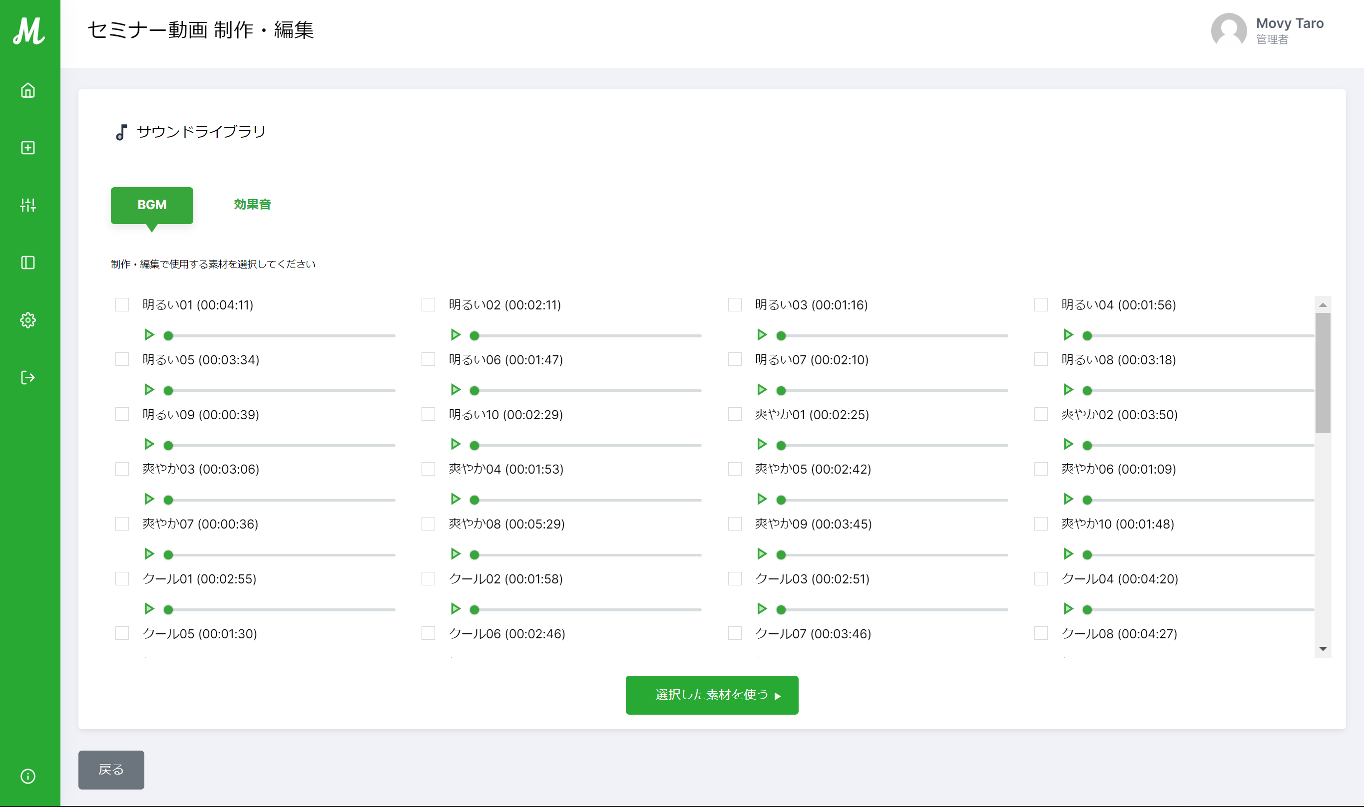 また、BGMや効果音をプリセット。著作権の心配もなく、音楽を探す手間を省きます。