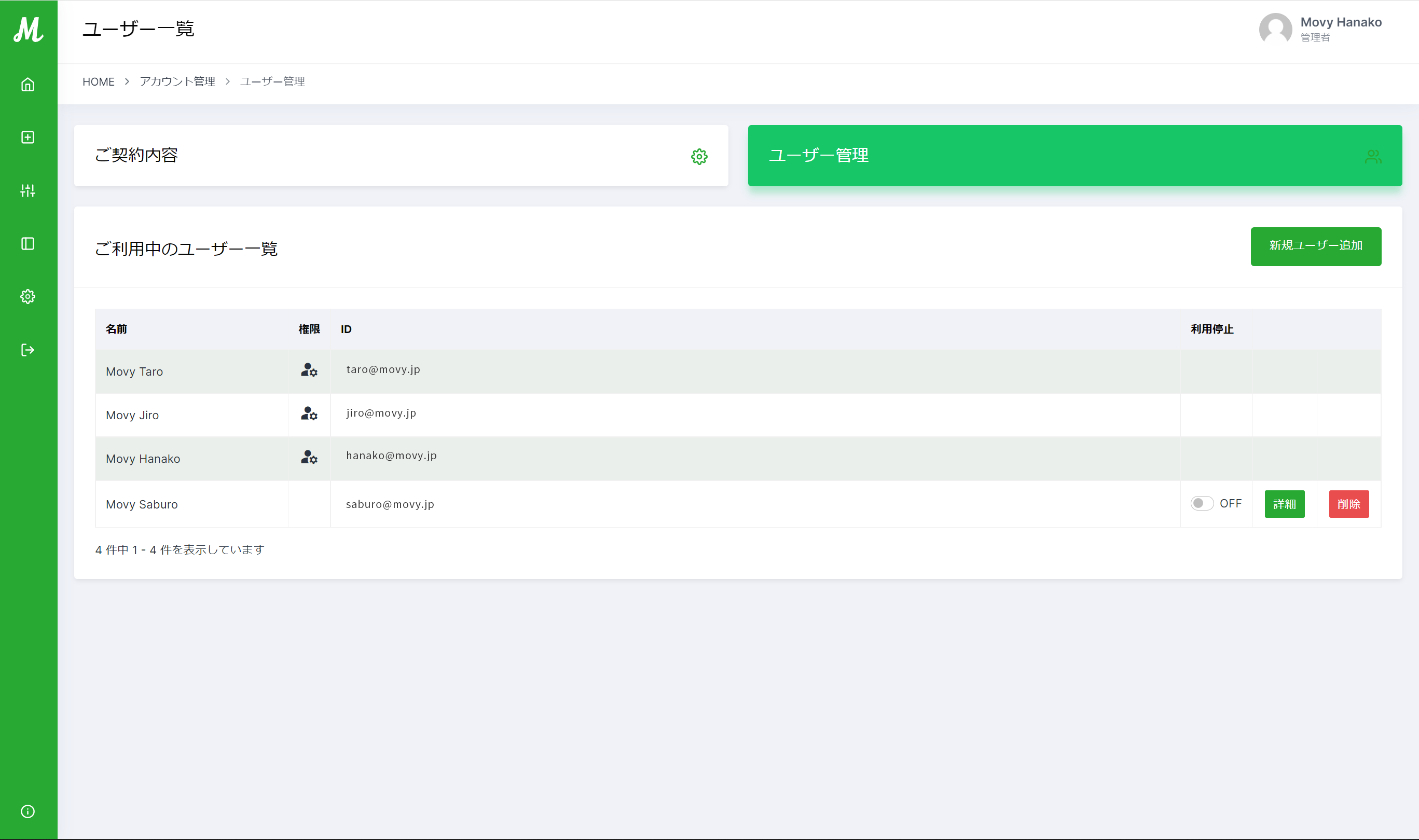利用するユーザーの権限管理と契約内容の確認ができます。