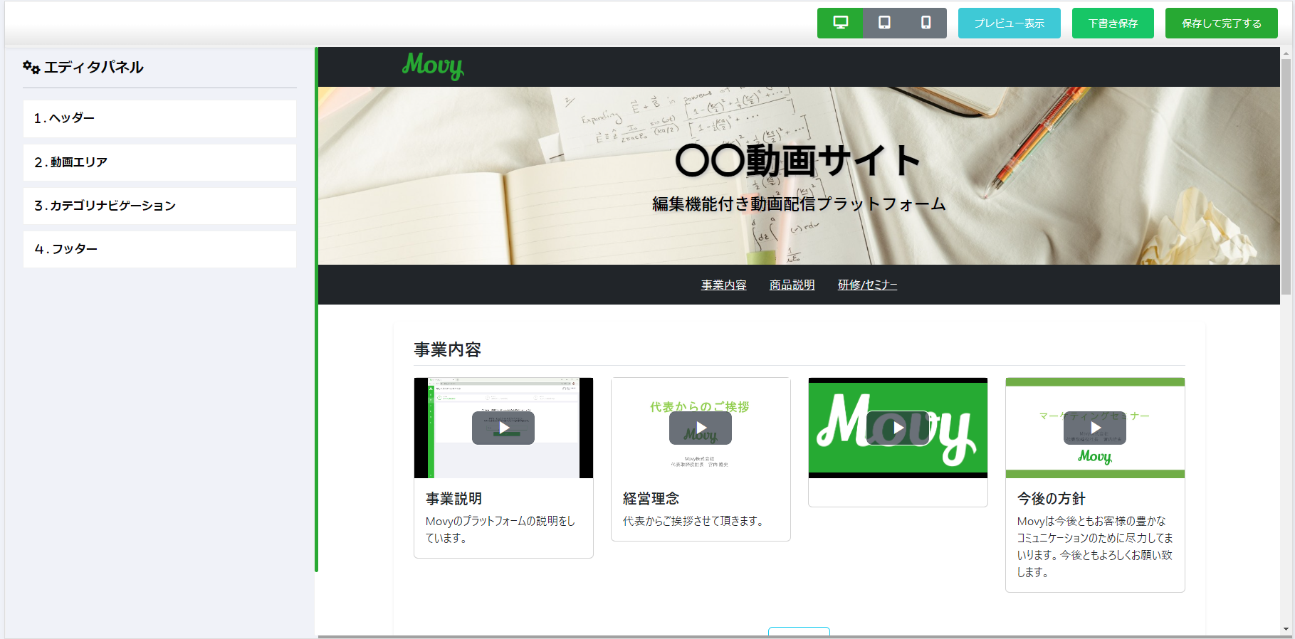 動画を用いたサイトが「誰でも」「気軽に」「簡単に」使え、動画を流すことができるだけでなくヘッダーやフッターも自由にカスタマイズすることが可能です。