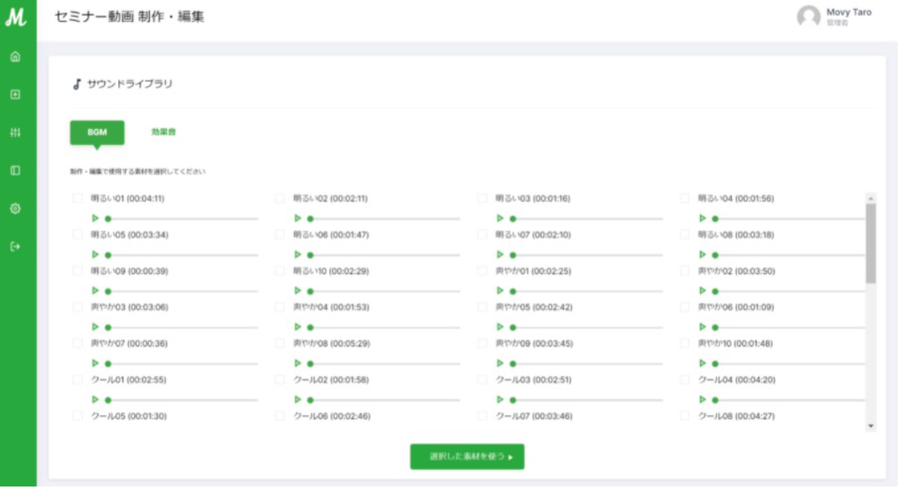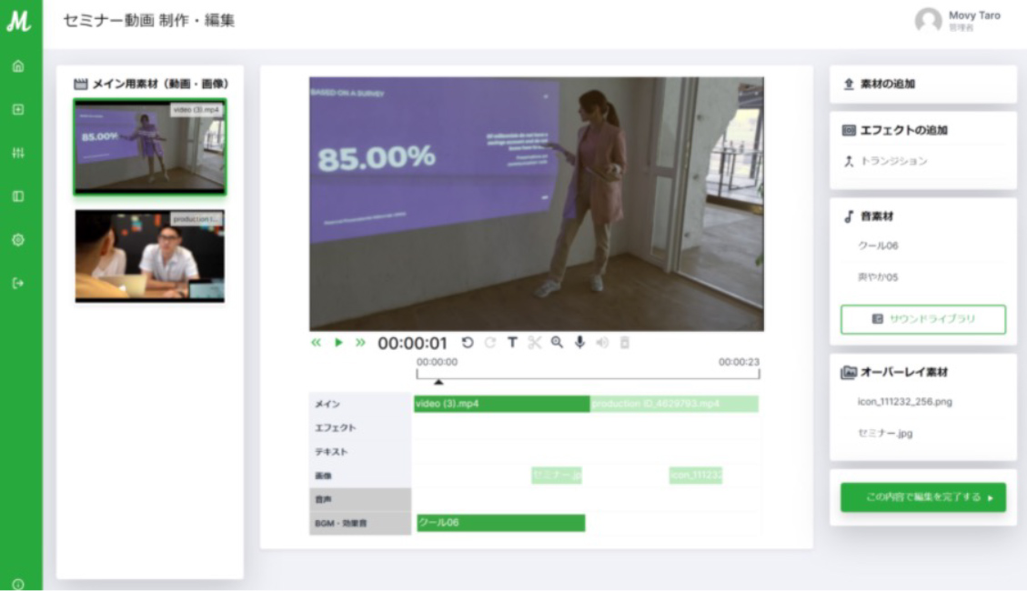 知識がない方でも簡単に、動画の編集・制作・配信・視聴分析まで一元管理が可能です。BGM・効果音もプリセットの中から追加費用なしで利用可能。ナレーション機能や、視聴分析など様々な便利機能を取り揃えています。